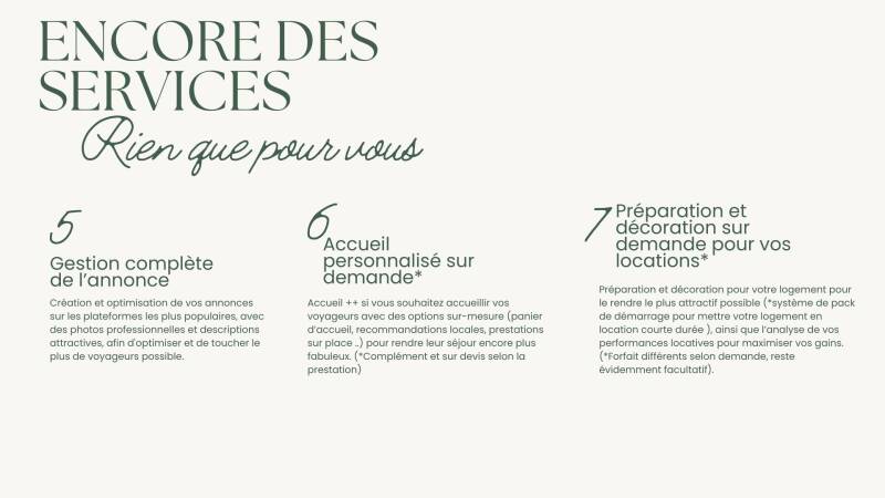 Nous prenons en charge l'intendance complète de votre logement, en nous occupant de chaque étape, de A à Z, pour vous garantir une expérience simple, personnalisée et sans tracas.